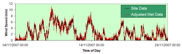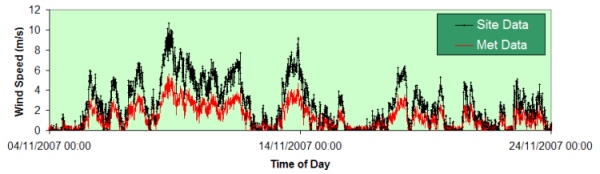 The mathematical term for the adjustment is 'correlation' and the above procedure is known as Measure-Correlate-Predict (MCP). It is a standard procedure for the large scale wind industry but Wind Measurement International is the first to bring this approach within reach of smaller developments. |
